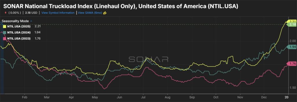 SONAR: National Truckload Index (linehaul only – NTIL.USA) for 2026 (blue shaded area), 2025 (yellow line), 2024 (green line) and 2023 (pink line). The NTIL is based on an average of booked spot dry van loads from 250,000 lanes. The NTIL is a seven-day moving average of linehaul spot rates excluding fuel. Spot rates stepped higher through peak season as new constraints on the driver pool (non-domiciled CDL restrictions and English language proficiency requirements) took hold.