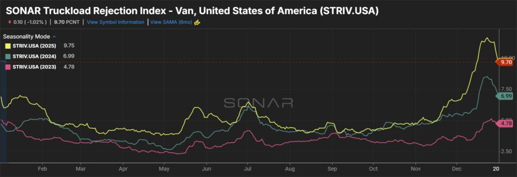 SONAR Truckload Rejection Index – Van (STRIV.USA) for 2026 (blue shaded area), 2025 (yellow line), 2024 (green line) and 2023 (pink line). A proxy for truck capacity, the tender rejection index shows the number of loads being rejected by carriers. Current tender rejections show a tightening truckload market. To learn more about SONAR, click on the image.
